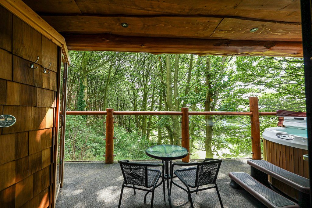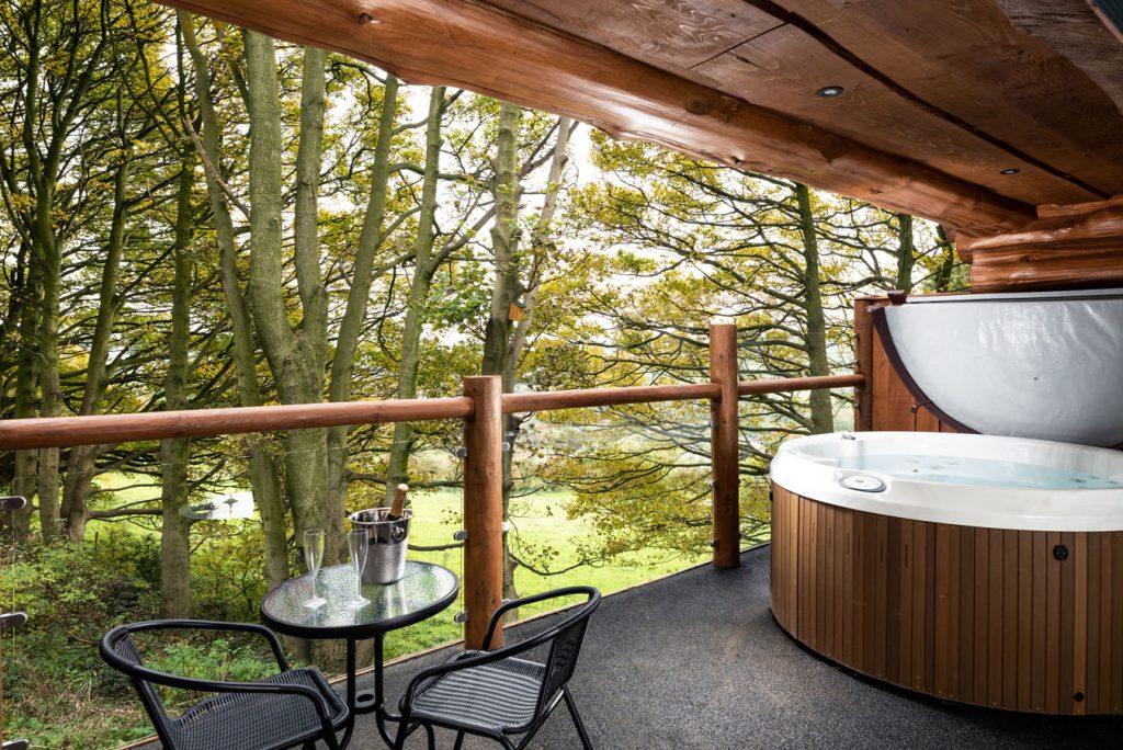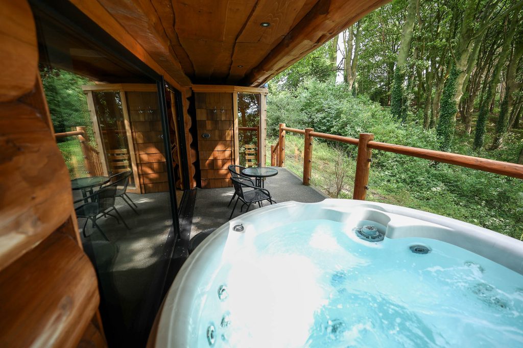 Large sliding glass doors open onto private decking with outdoor hot tub and sauna.