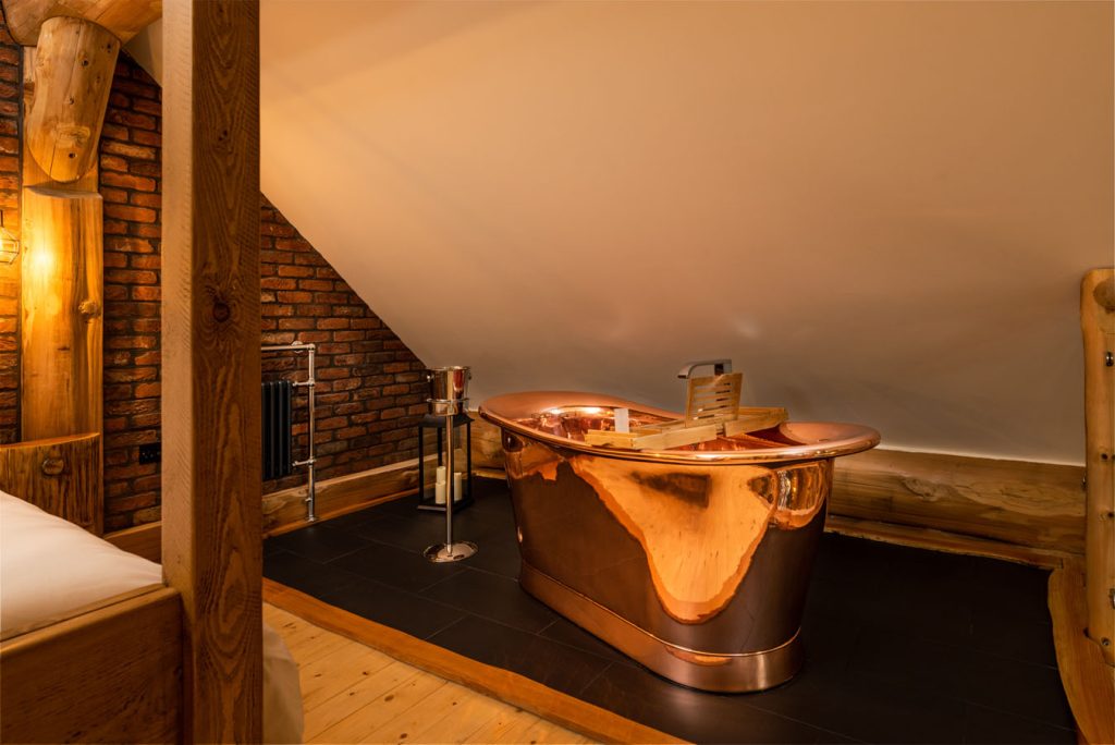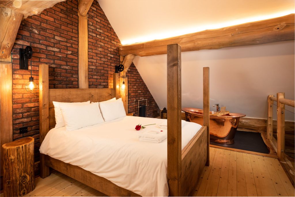 A whimsical staircase leads to an open plan mezzanine floor with a king size four poster bed, free standing copper bath and an internal bridge leading out to the first floor balcony.
