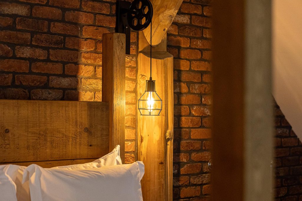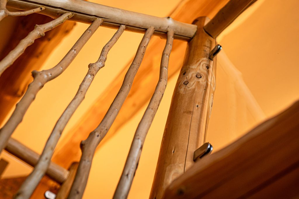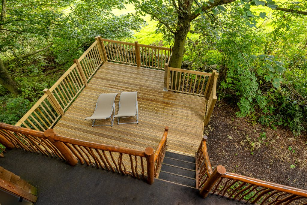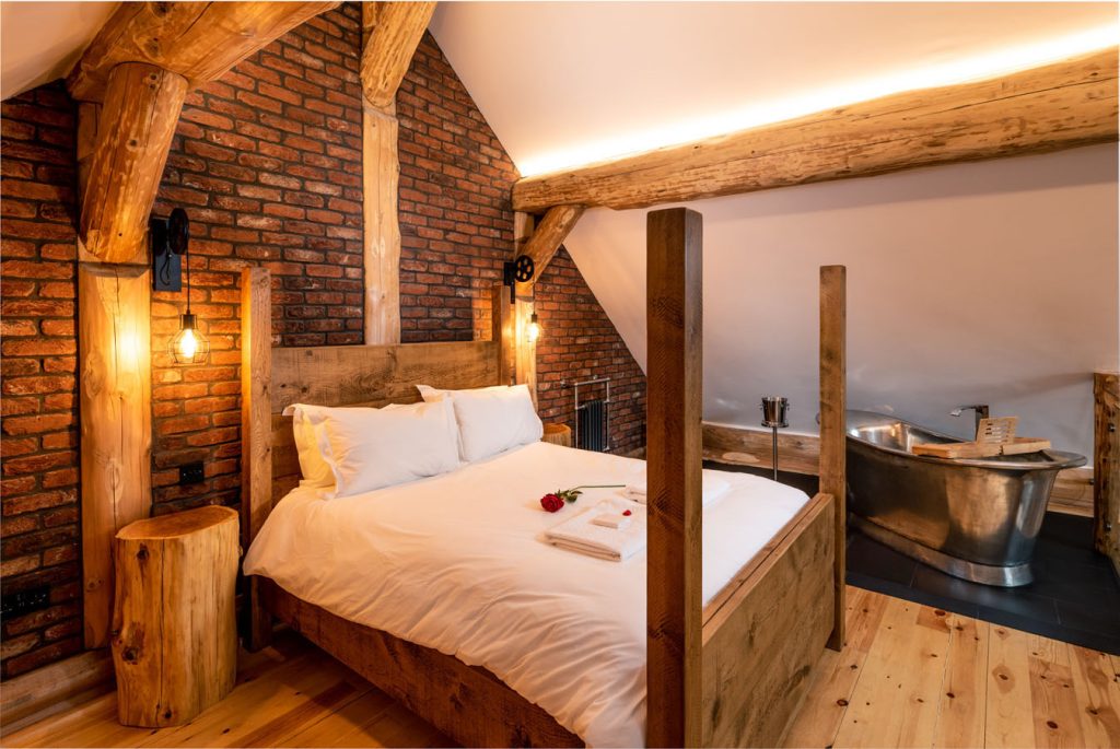 Large sliding glass doors open onto private decking with outdoor hot tub and sauna. A whimsical staircase leads to an open plan mezzanine floor with a king size four poster bed, free standing tin bath and an internal bridge leading out to the first floor balcony.
