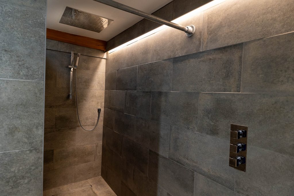 - Walk-in rainforest shower for two